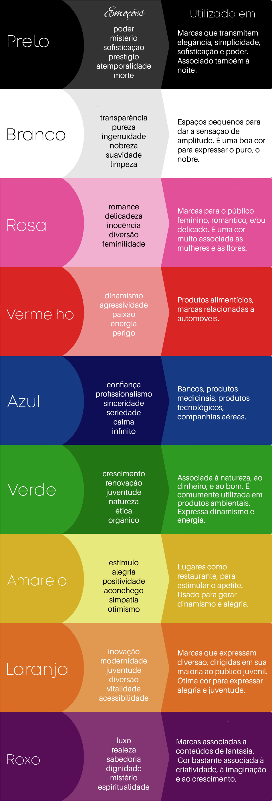 Cada cor tem seu significado. Algumas cores são universalmente LIGADAS a um sentimento e tem uma ótica geral para o mundo. Na tabela abaixo podemos ter uma visão delas.