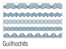 Guilhochês em justaposição de matizes, que geram a percepção de cores secundárias de cinza e sépia, em desenhos, ondulares e outros itens de segurança incorporados ao documento.