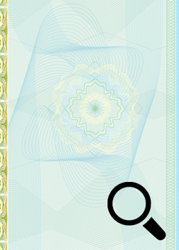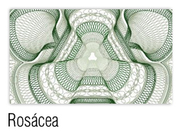 Rosácea que expande ao centro do documento, combinando e se entrelaçando no fundo numismático, em uma complexa combinação, em diferentes ângulos, em matizes que formam cores claras, gerando rara beleza no fundo de segurança.